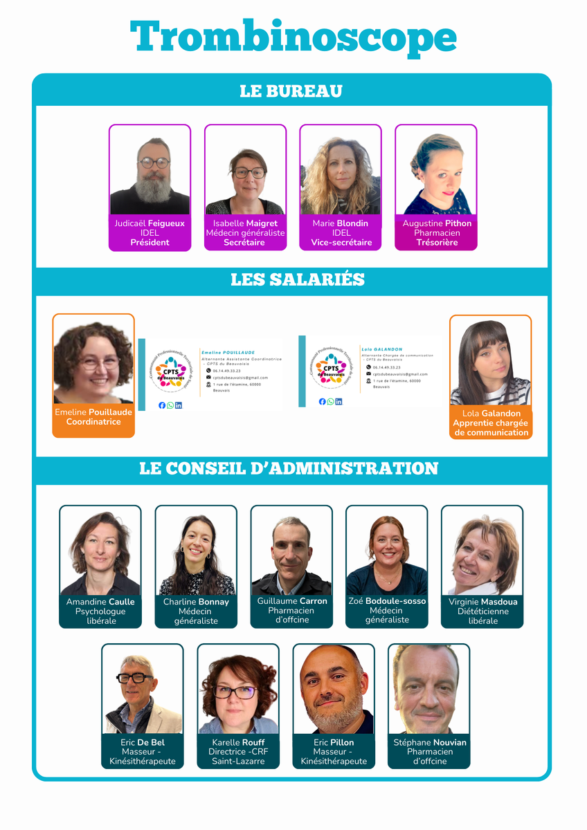 Le bureau de la CPTS ainsi que l’équipe sont disponibles pour accompagner et répondre aux besoins des professionnels de santé du territoire.